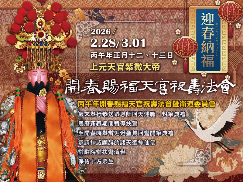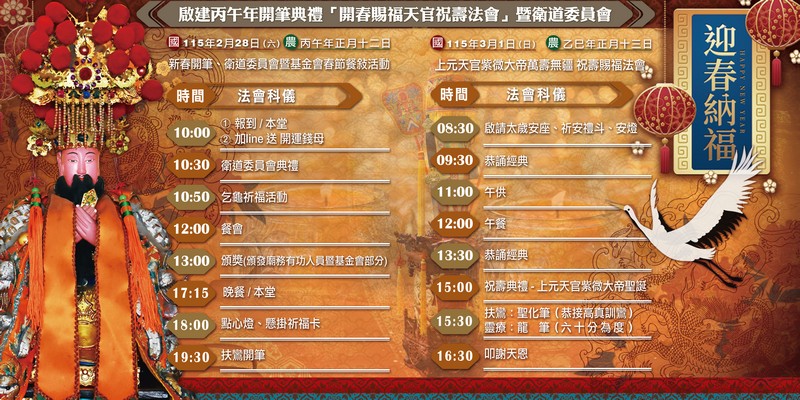 翌日 中華民國115年3月1日丙午年正月十三日星期日,啟建丙午年「開春賜福天官祝壽法會」、安奉「文哲太歲星君」等活動。
